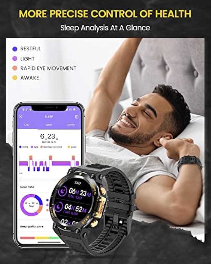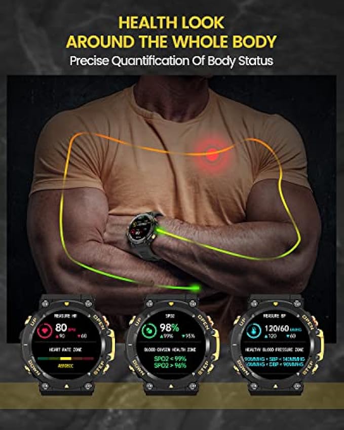 • HEALTH MASTERED ON WRIST - The tactical watch is equipped with a BIO 4.0 PPG optical sensor, which improves the accuracy of exercise heart rate and blood oxygen track by 8%, and also make accurately monitors light sleep, deep sleep, and REM periods. Military smart watch achieves more accurate health data collection capabilities. Motivate you to develop healthy habits and become a better version of yourself.