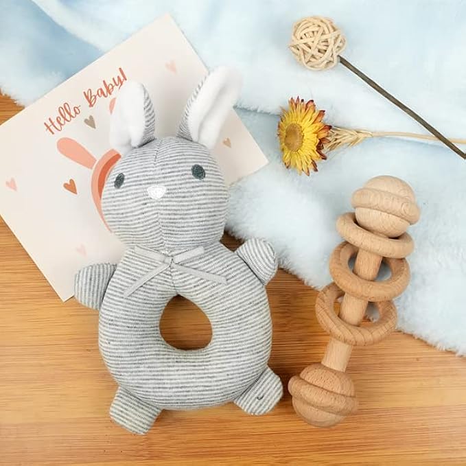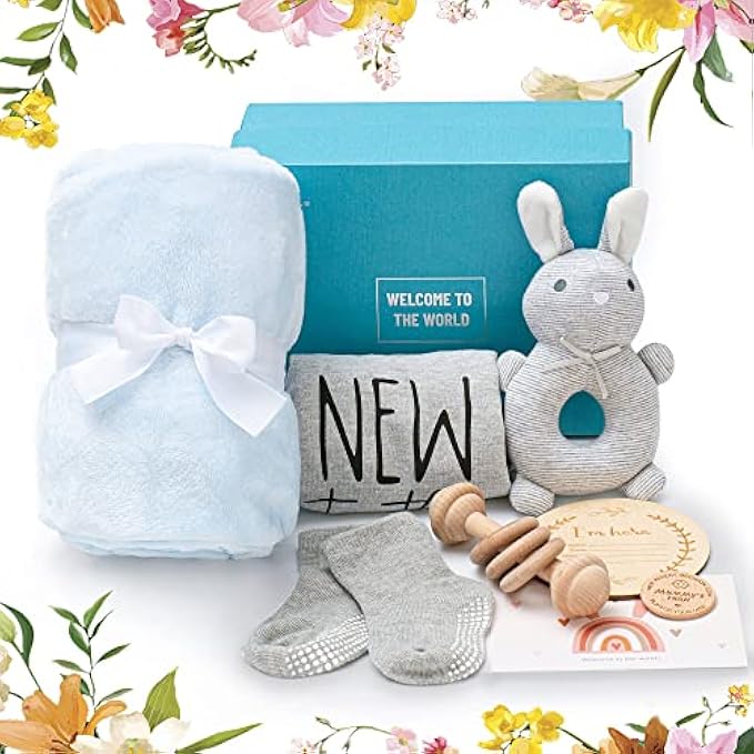 ? Everything You Need in One Box: For those who want a quick and easy baby shower gift solution, our baby registry welcome box is the answer! The box comes with a total of 8 accessories that all parents can use: blanket, onesie, socks, wooden rattle, bunny ring toy, baby announcement sign, flip coin, and greeting card.
