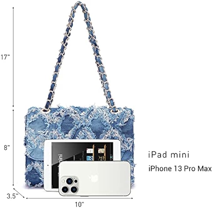 MATERIAL: This roomy blue distressed denim crossbody flap bag has a beautiful quilted design on intentionally faded denim. The shoulder strap is rapped with gold-tone chain. The clean blue fabric interior has a pocket along with a large zipped pocket.
