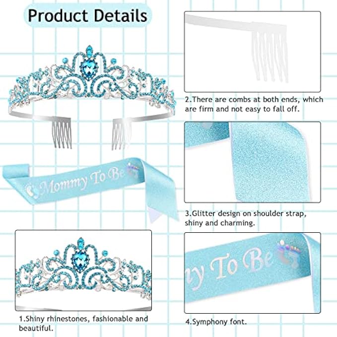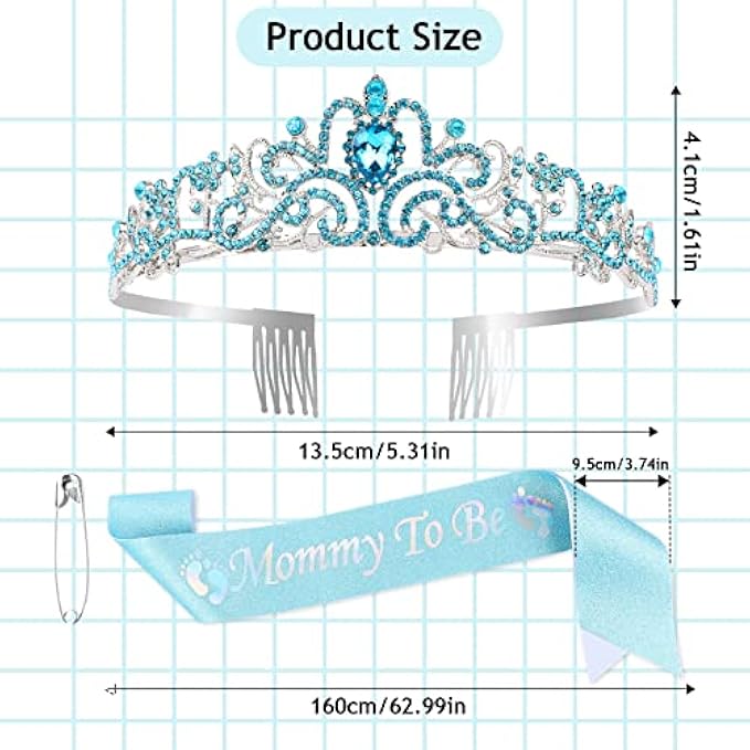 DAZZLING RHINESTONE TIARA: Our blue sparkling tiara crown is encrusted with sparkling rhinestones, making it the perfect accessory to complement your outfit and make you stand out in photos. The adjustable and stretchable design ensures a comfortable fit for any mommy-to-be.