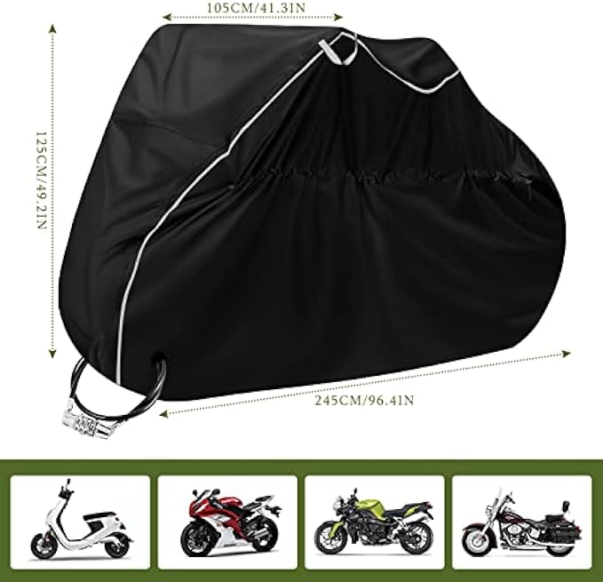 Motorcycle Cover, All Season Universal Weather Waterproof Sun Outdoor Protection Durable Motorbike Covers with Lock-Holes & Storage Bag Fits up to 96.5" Motorcycles Vehicle Cover