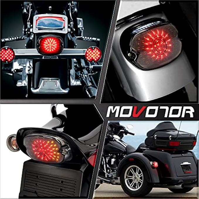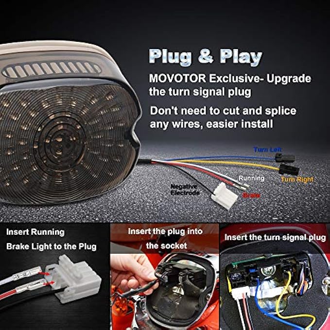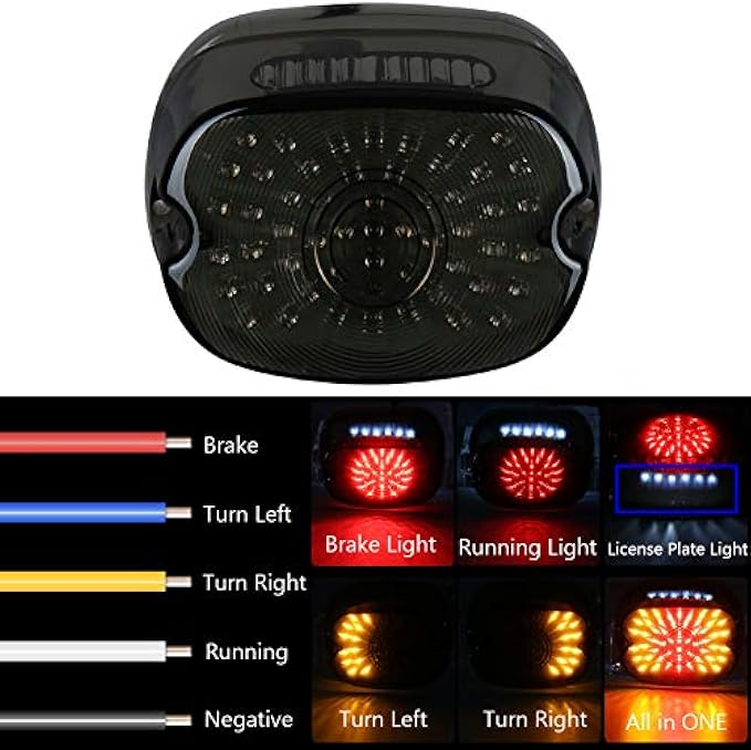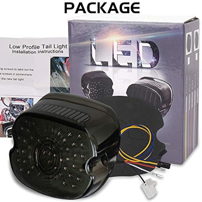 Plug N Play: MOVOTOR tail light with running/ brake/ integrated turn signal lights, brighter than stock tail light with smoked lens, upgrade the turn signal plug, directly plug and play, easy Install. Lay Down Style, which is angled to follow the curve of your rear fender for the streamline look. Functions All in one: This movotor taillights can be used as running light, brake light, turn signal light(turn left/right). White Light used as license plate light; The brake light and turn signals light built together. Providing good visibility, it makes your driving much safer. Fitment: Fits for Harley Sportster 883, Sportster 1200, Dyna, Tour Glides, Road Glides, Road Kings, All 1991-2010 FLST Models (except 1991-2000 FLSTF, 2005-2010 FLSTN, 1997-2003 FLSTS, 2005-2007 FLSTSC, 2010 FLSTSE);All 2002-2010 FXST Models (except 2002-2007 FXSTD, 2007-2009 FXSTSSE, 2008-2010 FXCW/C);1991-2010 Electra Glides (except 2005 FLHTCSE, 2009 FLHT Standard). Specifications:Voltage: 12V DC; High intensity led chips, Increased rear visibility, Easy to notice by others vehicles on road for safety driving. Lifespan: above 30000 hours; Wire for functions: Running--White Wire, Brake--Red Wire and Turn Signal: Yellow wire-- right turning; Blue wire-- left turning; Black wire--Negative. Package: 1 Piece Low Profile Smoked Led Tail Light +1 piece Gasket, come with the gasket to prevent water infiltration. Warranty:12 months quality warranty make sure you get risk-free tail light.Any product installtion issues, feel free to contact MOVOTOR via amazon message center, Notes: Login your amazon account > choose "Your orders" > find the order ID > click "Contact seller.