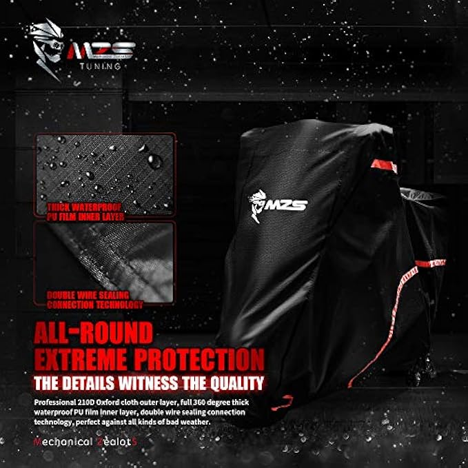MZS Motorcycle Cover - All Season Weather Outdoor Waterproof Protection fits up to 86 inch L compatible Sport bikes Cruiser - Durable Tear Scratch Proof Sunblock Vents Night Reflective Adjuster Buckle