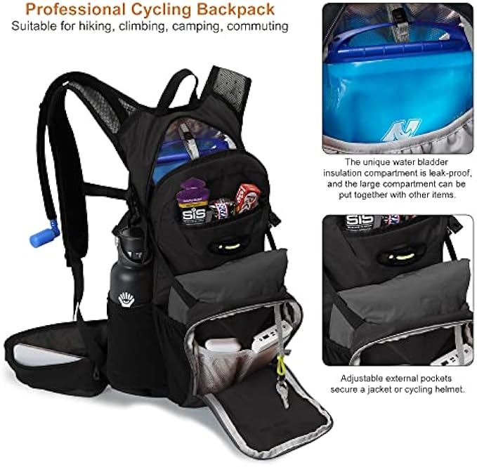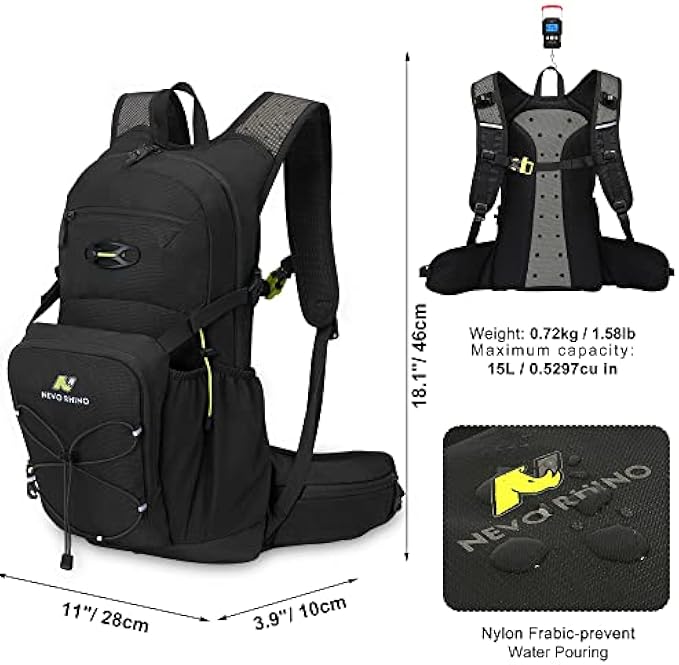 100% Nylon Imported 【Professional Upgrade Design - Ergonomic】: The hydration pack backpack is lightweight and breathable, ventilated mesh padding is added to the shoulder straps, waist straps, and back area to ensure the comfort of the pack. This water backpack can meet your all-day-long hydration needs. The 3l hydration bladder backpack has 2 reflective strips and 1 reflective strap that can safeguard your riding. 【Large Water Bladder】: Insulated hydration backpack's overall capacity is 15L+3L water bladder, the water bladder is made of PEVA material and does not contain BPA. Durable, insulation, kink-free sip tube, and push-lock cushioned bite valve; Large 2-inch (5 cm) opening easy to add ice and clean and dry, just bottom up and it will dry on its own. 【Insulated Bladder Compartment】: hiking backpack with water bladder with the special thermal insulated bladder compartment, hydration packs keep your liquids cool for up to 5 hours to guarantee that you can freely drink ice water. 【Multiple Storage Options】: water backpack for hiking with water bladder compartments of different sizes and functions assure you can bring everything you need for a trip! 3 zipper compartments can store your clothes, iPad, purses, snack, etc. 2 mesh pockets on both sides are perfect for a kettle and an umbrella. And 2 waist pouches on the belt can hold your valuables such as credit cards, phones, keys, etc. 【Multiple Usage】: Our hydration backpack 3l bladder is your perfect choice for cycling, camping, running, hiking, music carnival, commuting. This versatile backpack has all the gear you need on the go. N NEVO RHINO focuses on outdoor sports backpacks, and vitality blooms from here. 【Perfect after sale】 N NEVO RHINO hiking hydration backpack quality guaranteed. If you have any problems, please reach out to us, we will reply within 24hrs. (We provide replacement services for quality problems within 1 year and lifetime customer service)