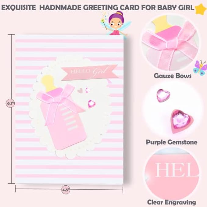 【Elaborate 3D Baby Shower Cards for Girl】with Pink appearance, milk bottle, gauze bow, pink and purple heart-shaped diamond design,our greeting card is handmade.The greeting card includes a handwritten sheet of paper which can be clipped to the greeting card. Women will love this delicate and lovely baby shower card.