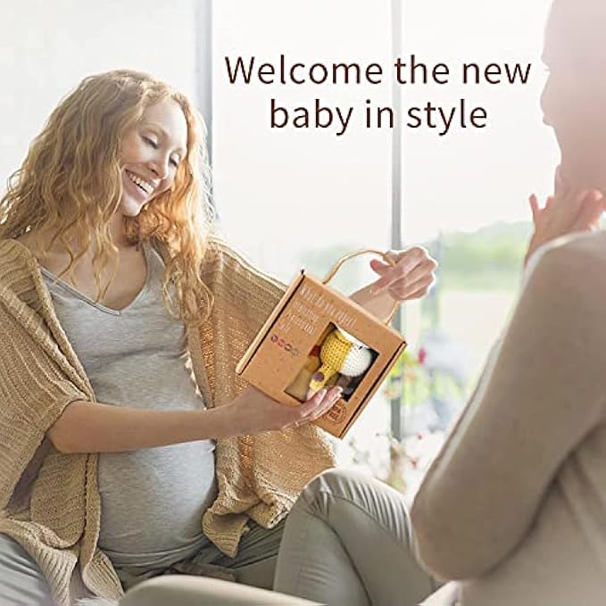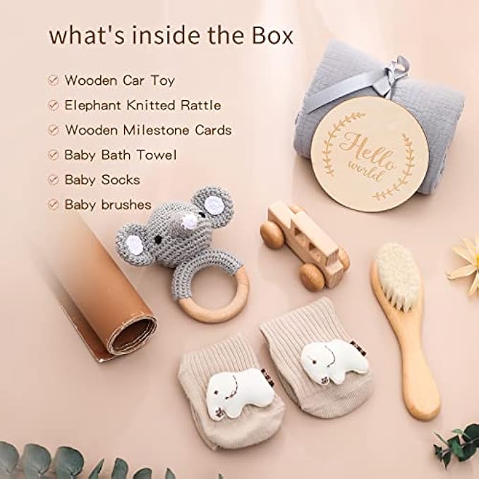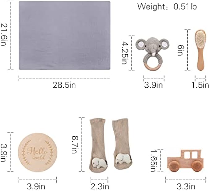 • ???Excellent Set - Are you nervous about being a parent and completely unsure of what to prepare for your baby? Do you want to give your baby warmth and comfort but not know how to choose? This set will be your excellent choice. It contains a baby blanket, baby brush, baby socks, wooden elephant rattle, wooden milestone piece, wooden car toy. These can completely meet the needs of the baby from birth to toddler.