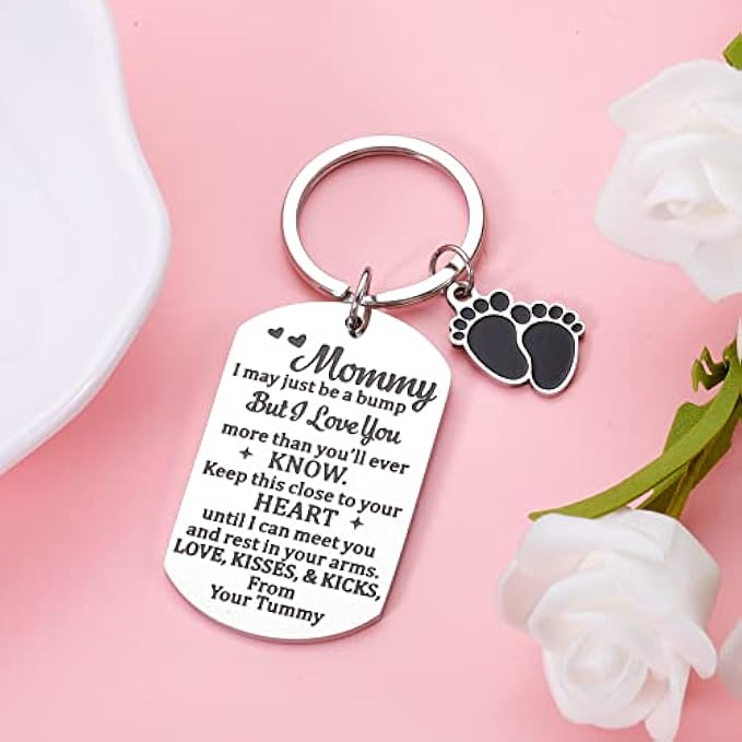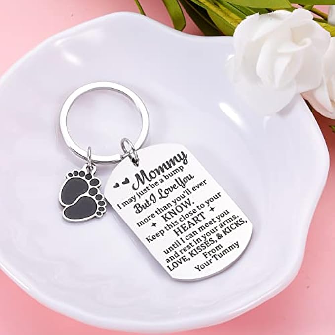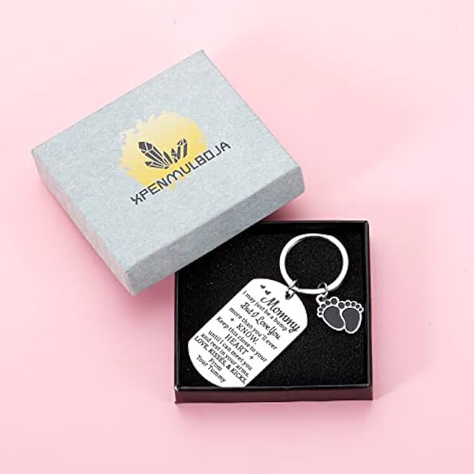 Pull On closure 【Mother's Gift for Mom from Son Daughter】-Engraved with lovely quote "Mommy I may just be a bump, but I love you more than you’ll ever know. Keep this close to your heart until I can meet you and rest in your arms. Love, Kisses, & Kicks, From Your Tummy", With a cute little footprints pendant, Engraved with the most sincere language in the world, express your love to your mother who loves you the most in the world and express your eternal attachment and love to your mother. 【Appreciate Love Quotes Keychain for Mom】- It's a meaningful and beautiful gift for New Mom, Mom Mother Mommy to Be Mothers Day Gifts, Pregnancy Pregnant Gifts for First Time, Expecting Mother Gifts for Christmas, Baby Shower Gifts for Mom to Be from Husband. Sending best appreciation from Son, Daughter, Husband, Friends. It's a great gift for your dearest wife or friend who is about to become a mother, and express the most sincere concern to her. 【Memento Mother's Day Birthday Gifts】-Perfect for Mother’s Day Gifts, Mother Birthday Gifts, Mom Christmas Gifts, Thanksgiving Gifts for Mom from Daughter Son, A thoughtful gift to celebrate a special sentimental moment, Pregnancy gifts for first time, Best valentine’s Day, Thanksgiving gift, and other family holidays, family gathering memento gifts. A perfect gift for farewell and leaving gifts to express appreciation. 【Recyclable Stainless Steel Material & Novel Design】The keychain is made of stainless steel material, Excellent materials and exquisite craftsmanship ensure the durability and sturdiness of the product. And it's not easy to bend, with durable quality. Simple yet stylish design, which is a perfect decoration and easy to carry and preserve. Novel and cute design with beautiful words, It's suitable for most people and will accompany you for a long time. 【Package & After-sales】We provide you with a nice gift box that is perfect for gift giving! Quality and Customer Satisfaction are our top priorities. If the gifts doesn't live up to your expectations, or anything goes wrong with your order, please contact us and we will solve it so soon as possible to make sure that you are happy with your purchase. We strive to put our hundred percent to resolve your issues and delight you.