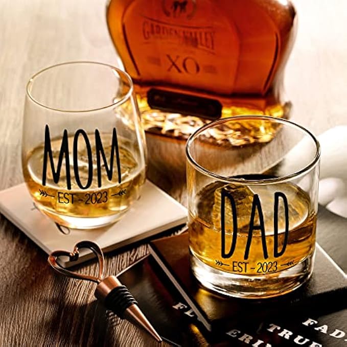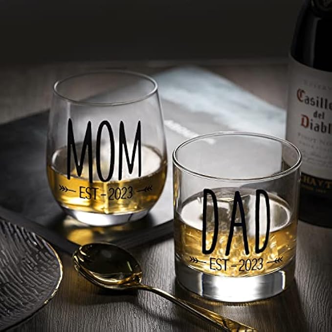 【GET A PERFECT GIFT FOR NEW PARENTS】 It is often hard to come up with a parents to be gift, so we have made it simple with our mom dad whiskey glass set with 0-3 month unisex onesie, and unisex socks with adorable quotes! A great new parents gifts. With mom Red wine glass and dad whiskey glass showing their new baby was est 2023!