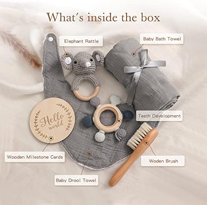 Newborn Baby Gift Set -Baby Gift Basket Baby Blanket Baby Rattle Toy Teether with Hair Brush Baby Milestone Baby Gifts Newborn Essential for Boys Girls(Elephant)
