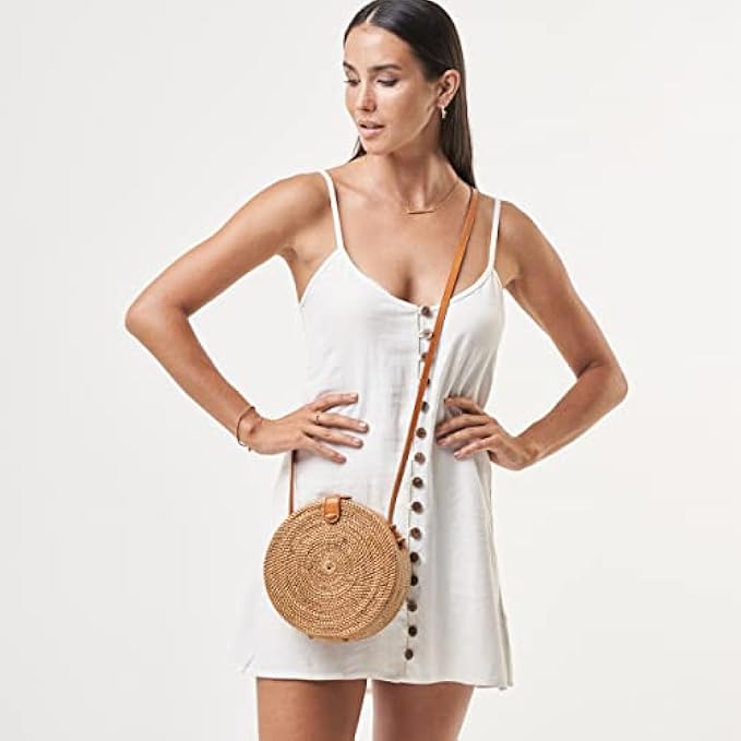 • ✔ [Perfectly Wearable] Our rattan bags are extremely lightweight and are made to fit all your must-bring essentials. Approximate Diameter: 7 3/4” (20 cm) Width: 2” 7/8 (7,5 cm). Leather shoulder straps length: 22" (55 cm).