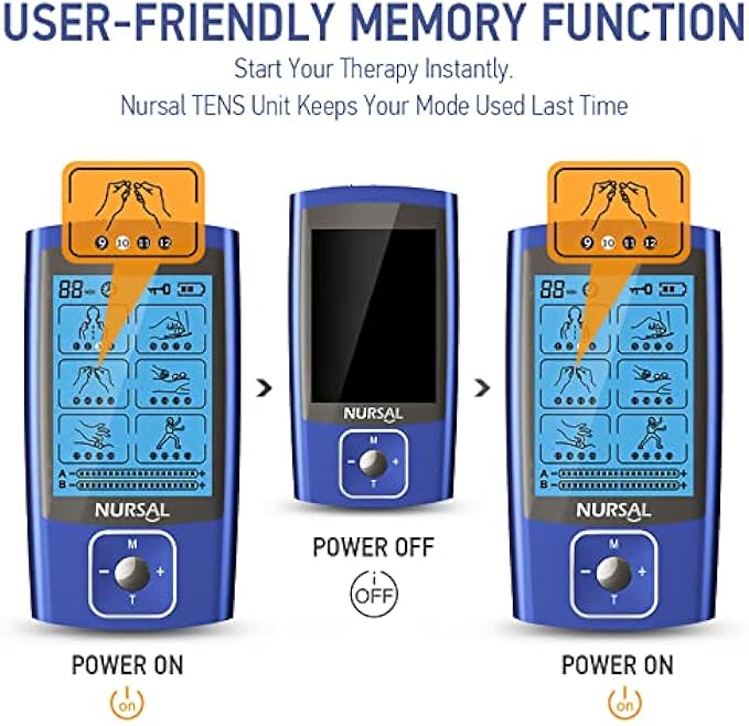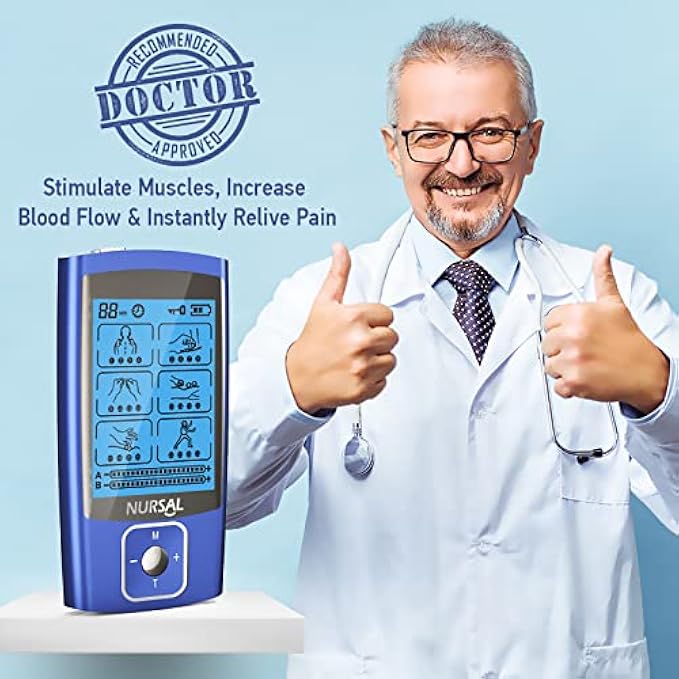 A/B DUAL CHANNELS TENS: You can set separate modes and intensities for channel A and channel B, the TENS machine last memory function will remember your preference of mode setting. Relax your body and relieve general body pain anytime with NURSAL electrotherapy muscle stimulator pulse massager and accessories. UP TO 24 MODES: NURSAL electric stimulator physical therapy comes with pre-promgrammed massage modes,like knead, acupuncture, beat, cupping, scraping and taichi. The mode1&2 of electrodes muscle stimulator are stable pulse modes which not fade in and out, perfect to use when doing household work. GET IMMEDIATE PAIN RELIEF: If you are suffering from pain and muscle soreness caused by conditions like neck/ back/ shoulder/ elbow/ knee pain, arthritis, sciatica, nerve pain, joint pain, period pain, sports injuries, you can use NURSAL portable tens device to get pain relief and pain management. POWERFUL RECHARGEABLE BATTERY: No worries about treatment interruption for dead AA batteries any more! This medical grade tens massager can give you continuous use up to 24 hours! It can be connected to the wall charger, power bank or laptop USB port to charge, and the power indicator would keep you aware of the remaining battery life. ENJOY WITH THE PORTABLE DESIGN: This NURSAL ems stim machine comes with a carrying bag, allowing you to carry it anywhere when necessary. It comes with 1pcs TENS Unit, 8pcs 2" Square pad, 4pcs 2"x4" Large pad, 3 Lead Wires, Pads Holder, USB Cable, Pouch, Cable Ties, User Manual, 12-month warranty, and 24-hours online friendly customer service.