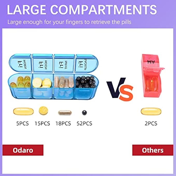 Odaro Weekly Pill Organizer 4 Times a Day, Daily Pill Box 7 Day, Large Travel Pill Case with 28 Compartment to Hold Medicine, Vitamin and Supplement (Color)