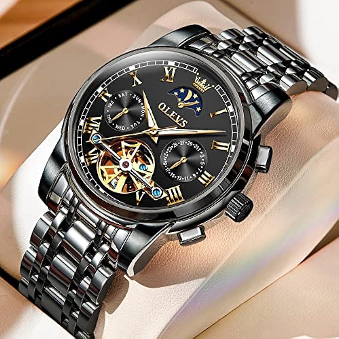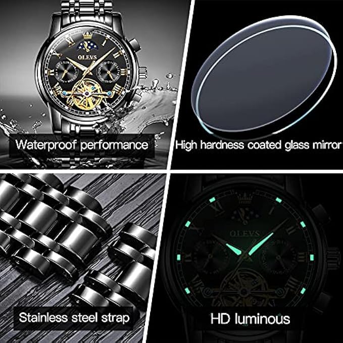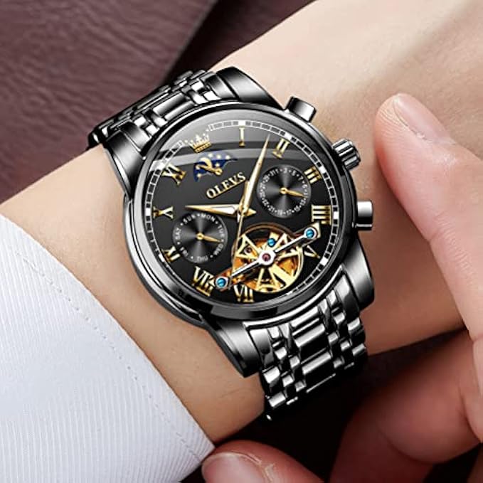 OLEVS Mens Automatic Watches Skeleton Tourbillon Mechanical Self Winding Luxury Fashion Dress Wrist Watch Moon Phase Day Date Luminous Waterproof