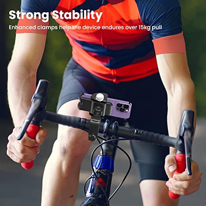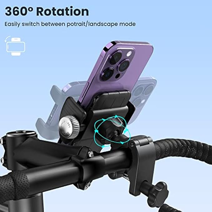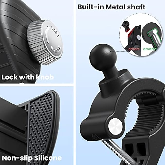 【No Block Camera】ORNARTO motorcycle phone holder adopts a half enclosure design that ensures your camera and side botton remains unobstructed, allowing you to capture stunning photos and videos while cycling. Moreover, this bike cell phone holder comes with a 360° rotating ball, providing you with the freedom to effortlessly adjust the phone to any angle while on the go. 【Secure and Stable】ORNARTO adjustable phone holder for motorcycle has non-slip silicone pads that prevents scratches and vibrations on your phone. The high-quality handlebar clamp with a built-in metal shaft securely fastens to the handlebar, keeping your phone steady on bumpy roads. 【Quick Handlebar Clamp】The upgraded handlebar clip is incredibly easy to install, enabling a quick and firm attachment to your electric dirtbike or motorcycle's handlebar without the need for any additional tools. It fits bike, bicycle, motorcycle, electric scooter, stroller, golf carts and more with diameters ranging from 0.67" to 1.3" (17mm to 33mm) 【One-handed Operation】Rotate the knob counterclockwise to expand the width of the phone holder clamp. Then place your phone inside and rotate the knob clockwise to securely lock it. Adjust the width of the phone holder clamp to fit your phone for the first time, and in the future you can enjoy quick installation, one hand to install and release in 1s. 【Wide Compatibility】This bike mount can fit all phones with a width ranging from 2.17 to 3.54 inches (55-90mm), including iPhone 14/13/12/11 Pro Max, Pro, Mini, iPhone 14 Plus, iPhone Xs Max, Xs, XR, X, iPhone SE, Galaxy S23, S23+, S22, S21, S10, S8, Note 9, LG, and more smartphones.