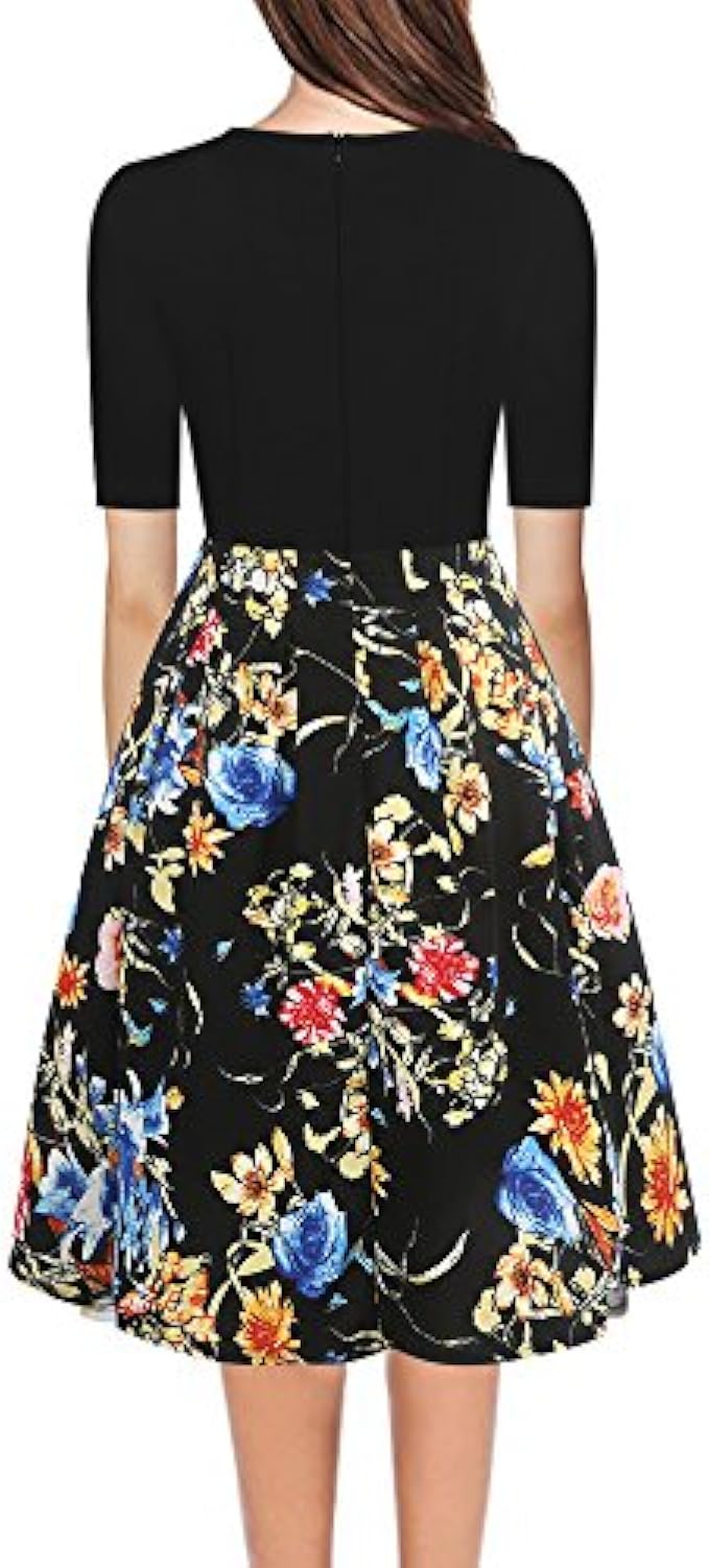 Women's Vintage Patchwork Pockets Puffy Swing Casual Party Dress O-Neck,Ball Gown,Fit and Flare.This dress have pockets in side.