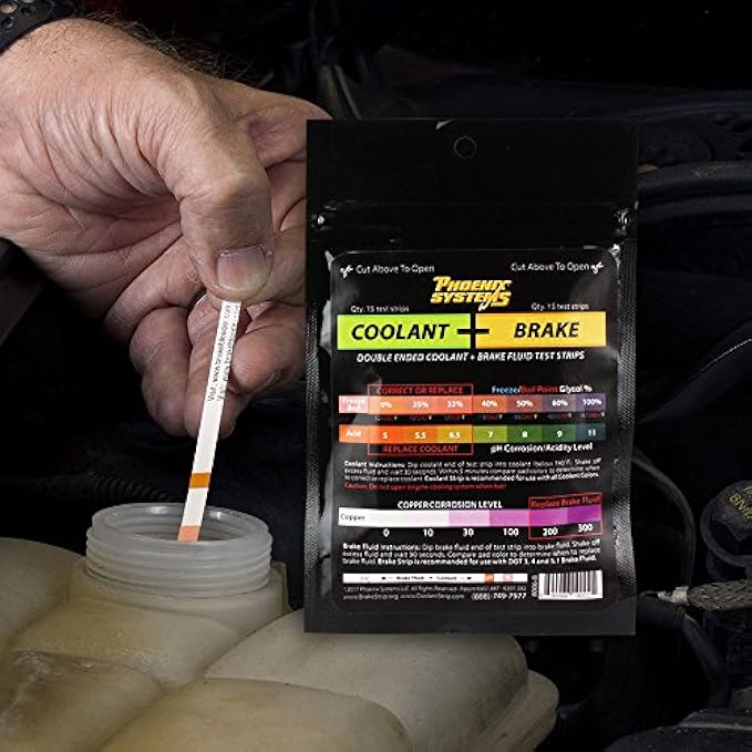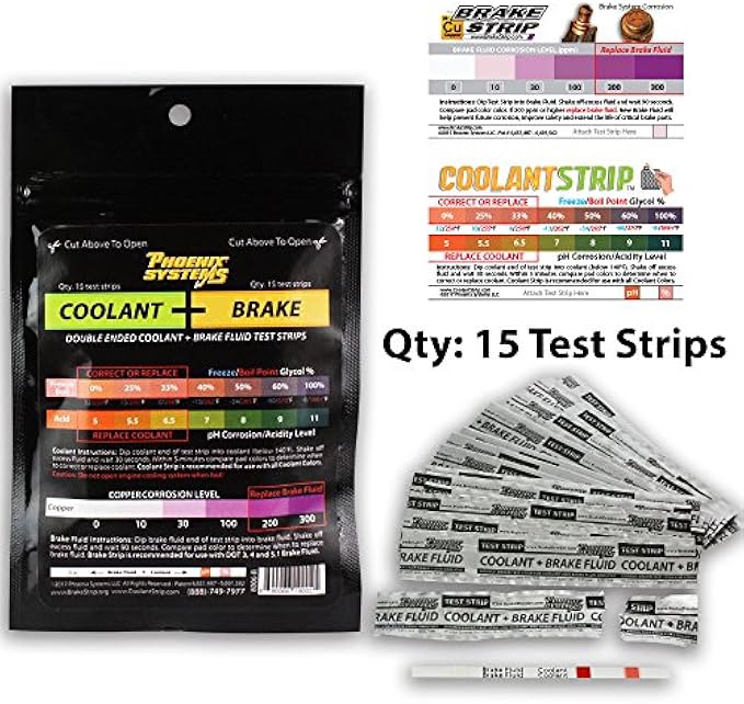Simply remove the test strip from the foil wrapper, Dip it into your Brake fluid then coolant/antifreeze, and 60 to 90 seconds later you will know the condition of your fluids. (Scientific proof)