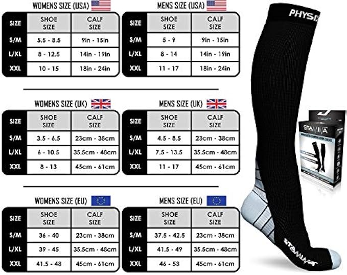BECAUSE PUSHING YOURSELF THAT EXTRA MILE MATTERS! Get your legs properly geared up for work, play, and everything in between! Great for day and night use, and perfect for those who are on their feet most of the time. With our socks, the compression and support are perfectly located on the heel foot calves so the toe area wont squeeze your toe joints. Provides instant comfort support, with moisture wicking properties that rapidly air dry in a few hours.