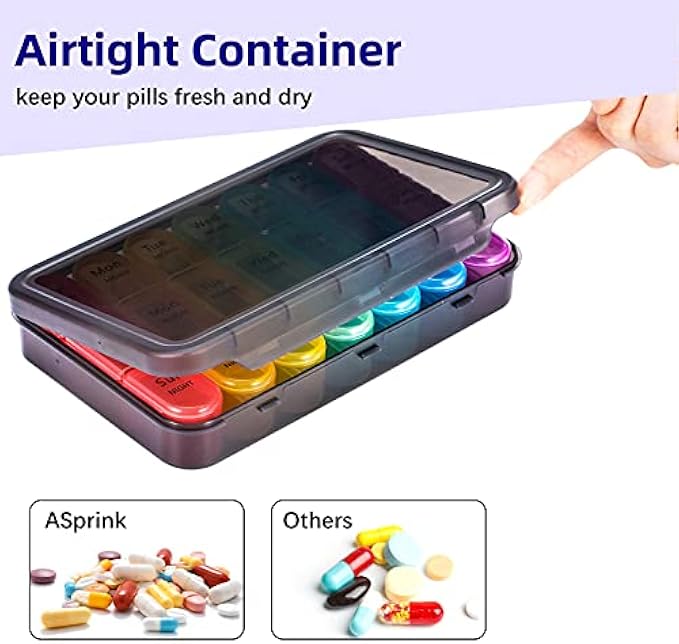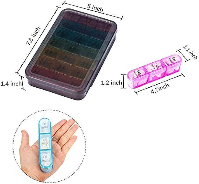 [Large Capacity Rainbow Pill Box]The weekly pill box organizer has 7 separate daily pills organizer for a week, total 21 large compartments. Each slot can store 10 fish oils and at least 80 small tablets. Plenty of room for all of your meds and keeping yourself organized.