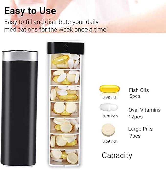 【7 Day Pill Organizer】Our 7 day pill box organizer can store up to 5 large supplements or 10-12 oval vitamins in each internal compartment.