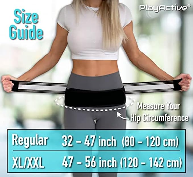 FIT MEASUREMENTS - The PlayActive SI Belt size REGULAR fits hip circumference 32 - 47 inches and size XL/XXL fits hip circumference 47 - 56 inches. Unisex design for men and women. Measure right above your hips, see our images for a visual illustration. The belt can be worn under or over your clothing. Stabilizing compression hip brace.
