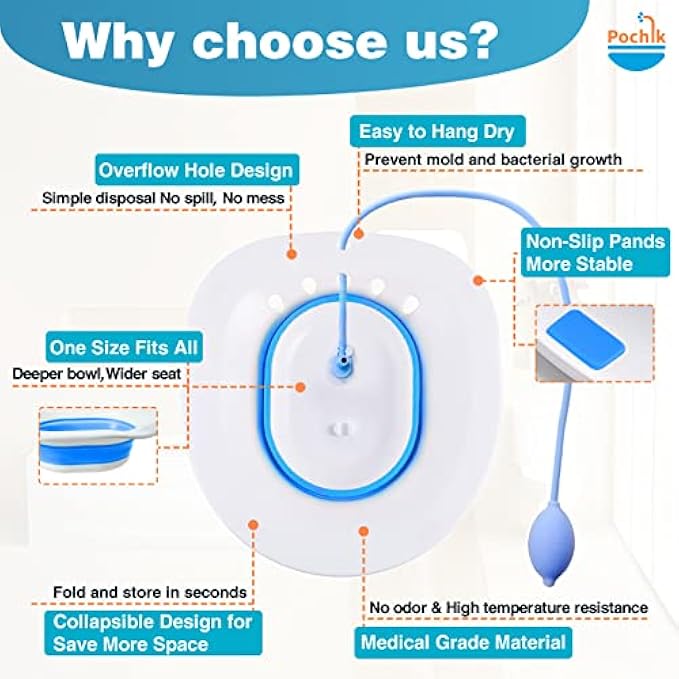 Pochik Sitz Bath, Sitz Bath for Hemorrhoids, Sitz Bath for Toilet Seat, Postpartum Care, Sits Bath Kit for Women, Collapsible, Flusher Hose, Drain Holes, Wider Seating Area, Deeper Bowl