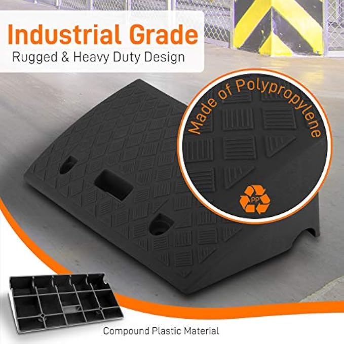 STURDY HARDWARE: This pair of mobility curb ramps for driveway are constructed from durable and high quality materials. Made of industrial grade compound plastic material or Polypropylene (PP) which is a strong type of material and is built to last
