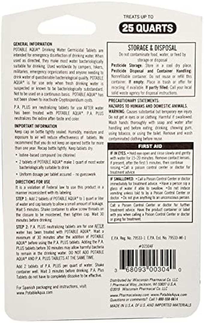 • One Bottle Of 50 Potable Aqua Water Purification Tablets And One Bottle Of 50 Potable Aqua Pa Plus Tables