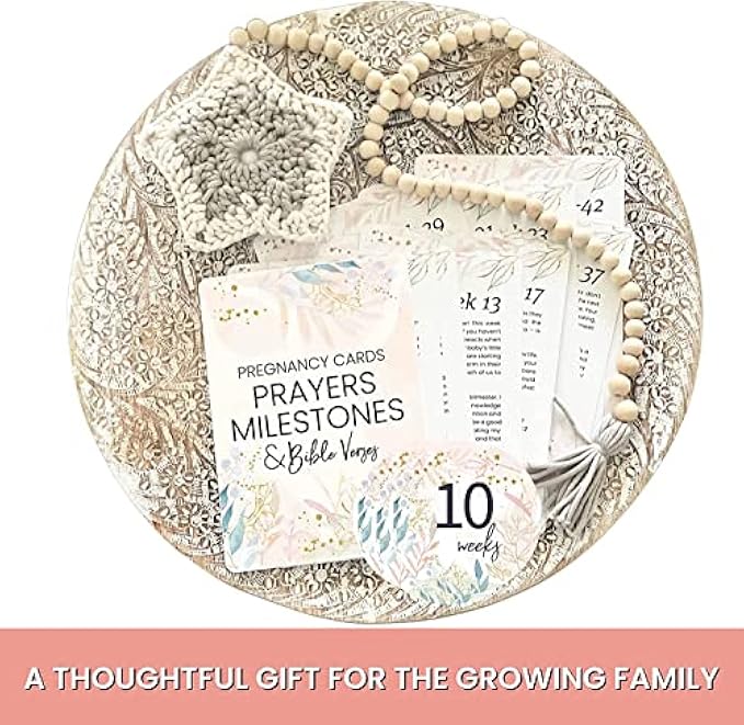 PREGNANCY MILESTONES SIGNS, WEEKLY PRAYERS and DEVELOPMENTAL MILESTONES: Celebrate each new week of pregnancy with a prayer that reflects the baby's developmental milestones. Each card includes a developmental milestone, a scripture verse, and a prayer for the expecting mother and her baby. As a pregnant woman and as a mother, these gender neutral cards will help her pray for the physical, mental, and spiritual development of her baby and herself.