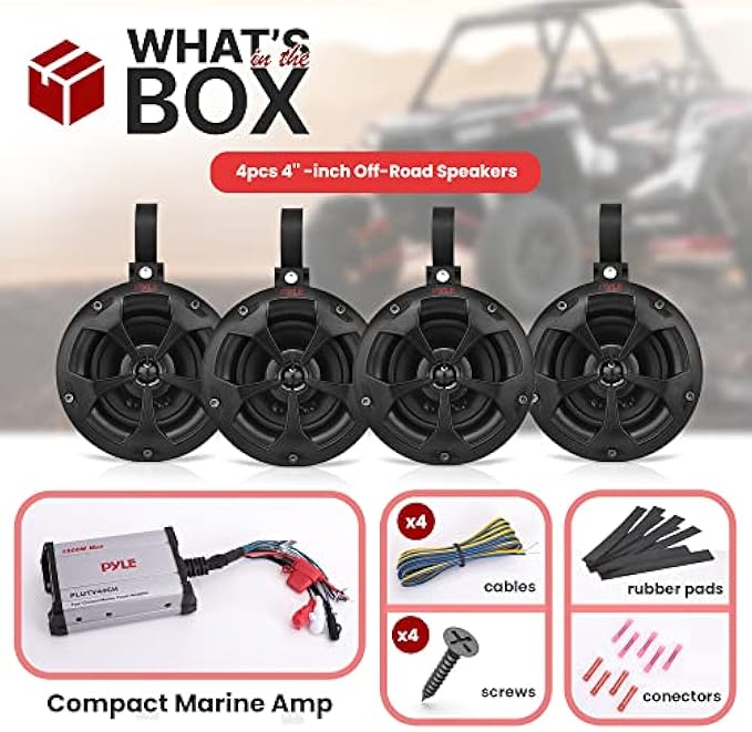• Enhance Your Ride: Enjoy high-quality audio with Pyle's 1500W marine-grade off-road speaker kit designed for boats, ATVs, UTVs, quads, Jeeps, and other outdoor vehicles. Kit includes (4) 4" 2-way off-road speakers and a marine amplifier