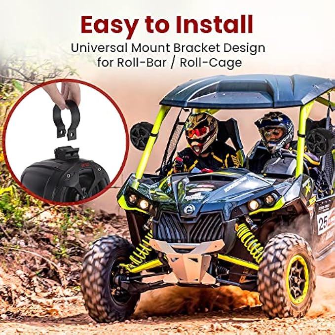 • Easy Installation: These weather-resistant speakers come in a heavy-duty molded cabinet with a protective butyl rubber surround Mount them on a support bar, frame, or roll-bar/cage easily The kit includes RCA-to-AUX 3.5mm and AUX (3.5mm) audio cables