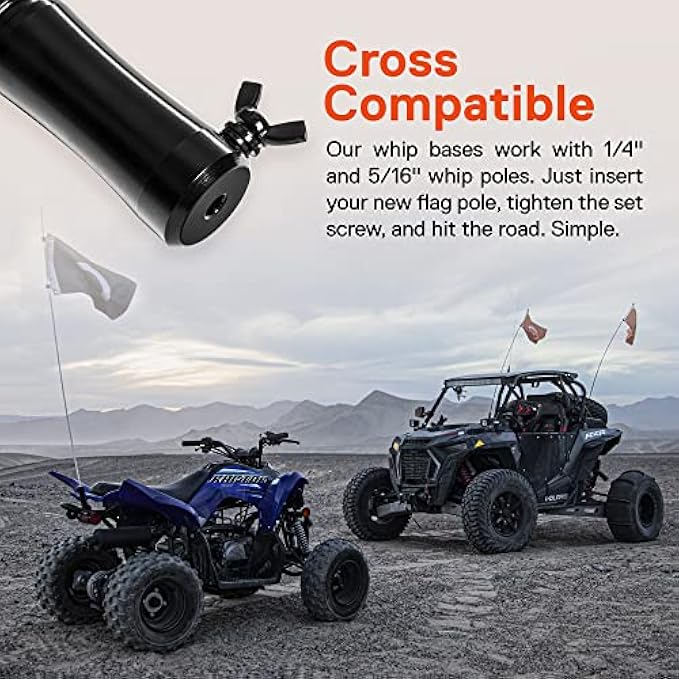 CROSS COMPATIBLE - Our whip bases work with 1/4" and 5/16" whip poles so there is no need to stress about whether your whip will work with our base. Just insert your new flag pole, tighten the set screw, and hit the road. Simple.
