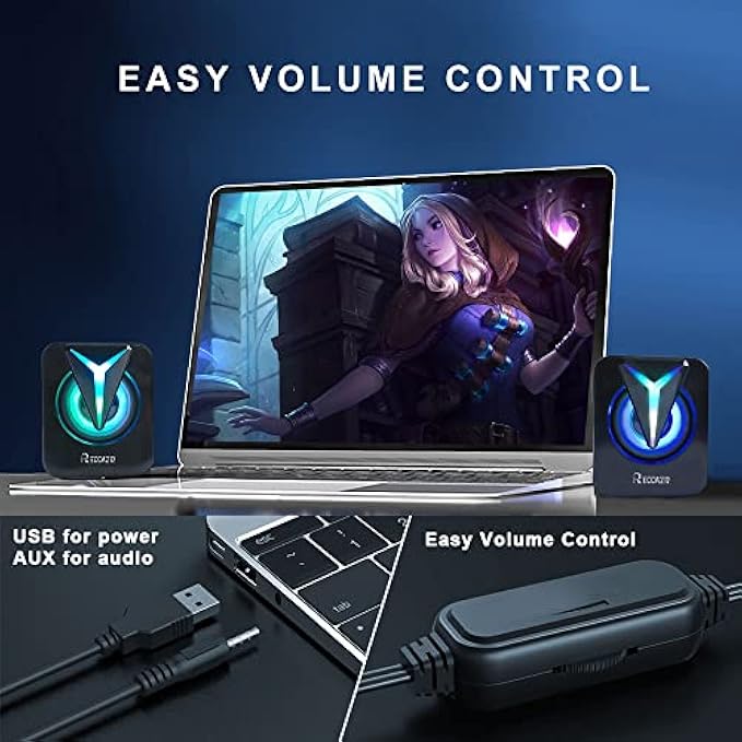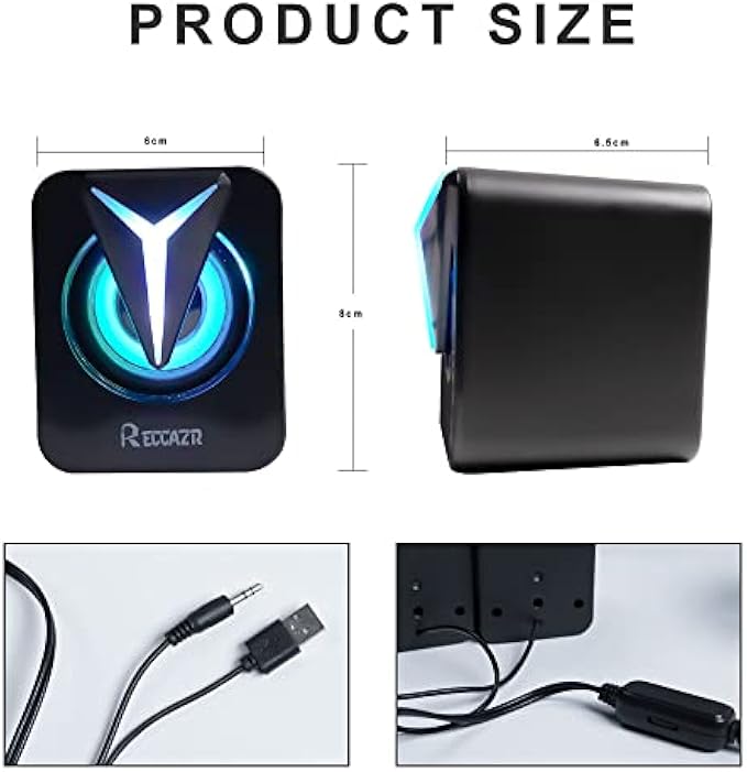 RECCAZR Computer Speakers, 2.0CH PC Speakers with RGB Lights, in-line Volume Control, 6W USB Powered Stereo Desktop Speakers with 3.5mm AUX for PC/Laptop/Projector/Tablet/Cellphone