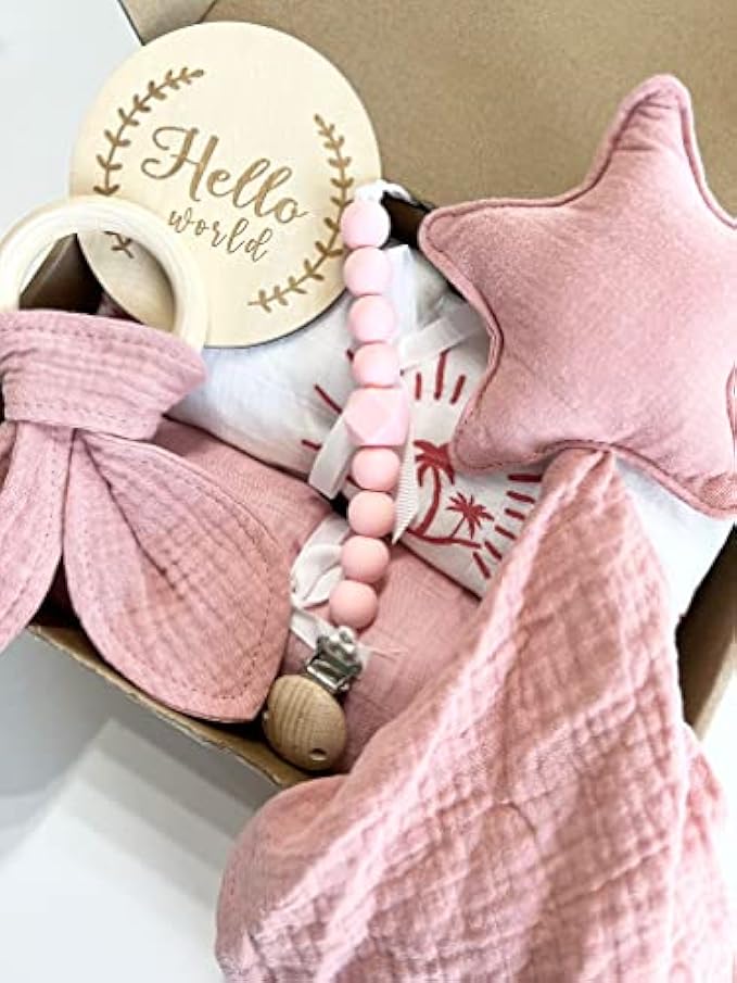 Remi & Rhino Baby Gift Set Newborn Gift Swaddle Blanket Rattle Silicone Pacifier Clip Babygirl Baby Shower Giftset Gift Basket Girl Hospital (Pink)