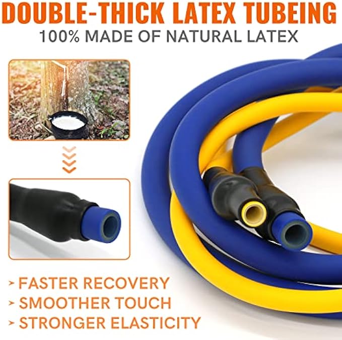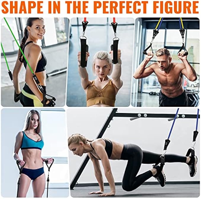 THE LATEST UPGRADED 105LBS RESISTANCE BANDS: Our resistance bands for working out are made of 100% healthy and environmentally friendly natural latex material, which have smoother touch, stronger resistance and better wear resistance! The exercise bands resistance have 5 different strength levels, corresponding to 5 different colors (yellow 5 lbs, green 15 lbs, red 20 lbs, blue 30 lbs, black 35 lbs), which can be used alone or stacked in any combination to a maximum equivalent of 150 lbs. LOAD-BEARING UPGRADE ACCESSORIES: The resistance band set includes 5 workout bands resistance, 1 door anchor, 2 cushion handles, 2 ankle straps and 1 carrying bag. The door anchor for resistance bands, the ankle straps and the resistance band handles have been enlarged and widened to achieve easier grip, greater load bearing and safer exercise environment! Besides, the foam handle is soft and comfortable, the nylon fabric is durable and wear-resistant, and the metal hook and loop is strong! YOUR PERSONAL POCKET GYM: The exercise bands resistance bands set can be used in conjunction with any popular workout such as yoga, Pilates, aerobics as well as for general exercise, stretching, strength training and more. If you are busy with your career, or a full-time mother, and exercise time is limited, then the elastic bands for exercise can perfectly replace the role of the gym, and you can carry out effective exercise at home, at office even in park! FFFECTIVELY CREATE THE IDEAL HEALTHY SHAPE: Our resistance band is not only effective for practicing squats, push-ups, leg lifts and triceps, but also can help you improve coordination, endurance and flexibility. And the ankle straps can better strengthen leg muscles. In addition, the work out bands can also help train hips, shape perfect chest and abdominal muscles, and show your charming body curves. Whether you are a beginner or an experienced fitness enthusiast, you can easily get started. PERFECT FOR PHYSICAL THERAPY: The workout bands resistance are very effective for muscle strength, movement and motor function, and reduce joint pain. Therefore, the stretch bands for physical therapy can help to improve the living ability of the functional elderly, improve the athletic performance of athletes, help to treat many chronic diseases, also help to enhance coordination, enhance endurance, flexibility, range of motion, exercise different muscle groups.