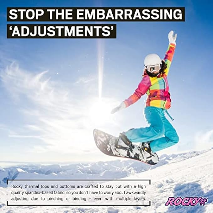 NO MORE AWKWARD ADJUSTING THANKS TO ELASTIC SEAMS: Check out the pictures and see how this women’s thermal underwear set is crafted using elastic seems that keep tops and bottoms from falling down or bunching up (even on long walks to school), and if your family enjoys skiing, snowboarding, or ice skating then Rocky makes a great base layer -- but without the sagging and ‘awkward adjustments’