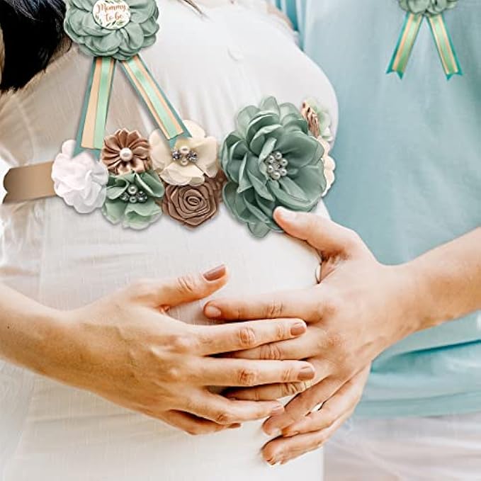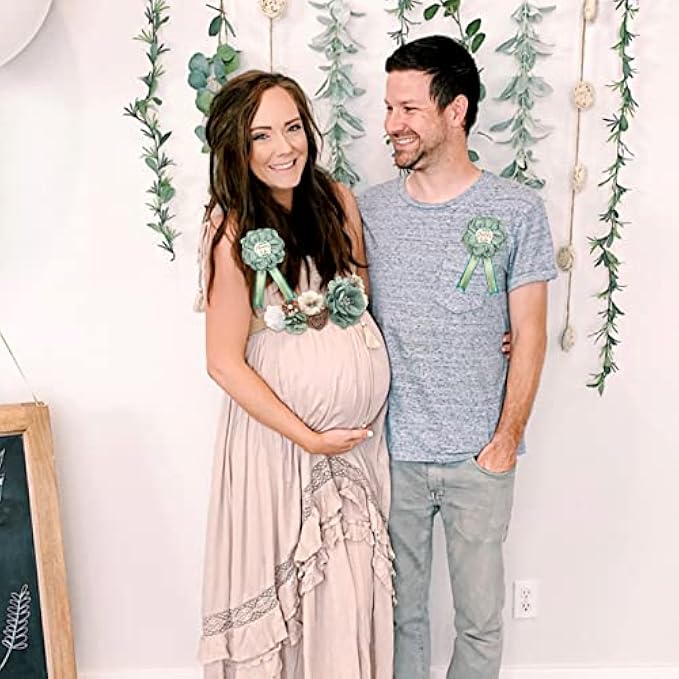 Sage Green Maternity Sash and Corsage Pin Set Mom to Be Daddy to Be Corsage Greenery Theme Baby Shower Decorations Olive Green Belly Belt Gender Reveal Party Gift Keepsake Pregnancy Photo Props