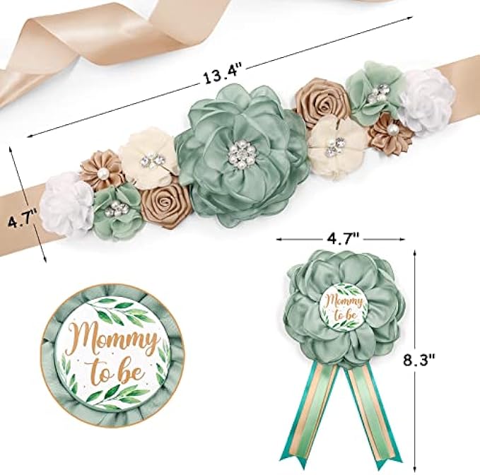 • 【Sage Green Maternity Sash & Corsage Pin Set 】Package includes 1 pc sage green theme maternity sash decorated with rustic ivory fabric flowers, 1 pc mom to be corsage pin and 1 pc daddy to be corsage pin. They are all pre-assembled and ready to use!
