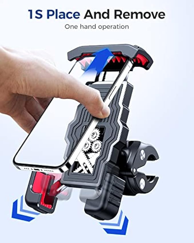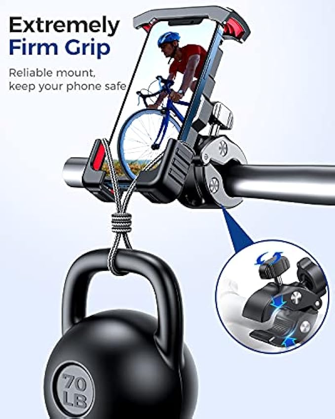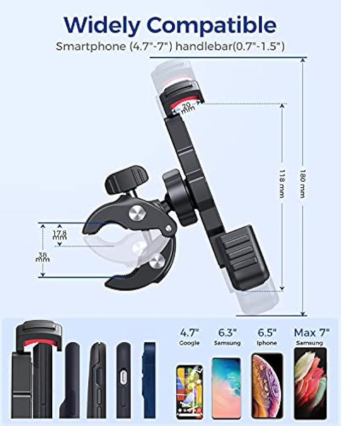 ?【Upgraded Solid Clamp】Newest 3.0 version, the clamp is upgraded with a robust metal built in. After 1000 times high pressure tests, strong enough and resistance for heavy use. No worries about it will be break off. ?【Super Stable with 3 Upgraded Parts】First, anti-slip hard rubber added to the handlebar clip increase the grasping force, so the bike phone holder won’t flip down or wiggle around. Second, the ball-joint part used high density materials that prevents it from breaking. Third, has 4 metal-made arms that are strong and super solid, so won’t break like the band or plastic ones. ?【Hold Your Phone Securely】With a red high-speed switch, you can even ride 60mph on the bumpy road without issue. The backplate and 4 corners are all padded with anti-scratch silicone, which is very shakeproof and has great cushion for rough roads. ?【3s Tool-free Easy Installation】Within 3 seconds, without tools, even a schoolchild could install the bike phone holder on the handlebar quickly. ?【1s Quick Lock & Release】Tilt your cell phone to push the top, the bicycle phone mount will automatically grip your phone firmly. While push the top again releases it. All with one hand. ?【360°Rotation & Widely Compatible】360°view-angle adjustable. Compatible with handlebar from 0.7” to 1.5”, you can use it on your ATV, scooter, stroller, peloton, etc. Cellphone from 4.7” to 6.8”, thickness (with case)≤0.71”, support iPhone 12 Pro Max, 12 Pro, 12, 12 Mini, SE 2020, 11 Pro Max, 11 Pro, 11, Xr, Xs, Xs Max, X, 8 Plus, 8, 7 Plus, iPhone 7, Samsung Galaxy S21 Ultra, S21+, S21, S20 FE, S20, S20+, S10, S9, Note 20 Ultra, Note 20, Note 10+, LG, Google Pixel, Motorola,One Plus, etc. ?【Worry-Free Warranty】A two years warranty are offered. If there is any problem or question, please kindly contact us first. We will try our best to provide you a great solution.