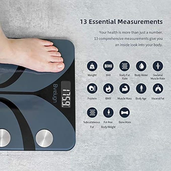 13 Essential Body Composition - The smart scale not only shows weight but also BMI, body fat, subcutaneous fat, body water, protein, BMR, body age etc., by electrical Bio-Impedance Measurement Technology. The data will sync to the app when your phone and scale connect successfully. It makes you know more data clearly about your body in time and track progress easily on your phone.