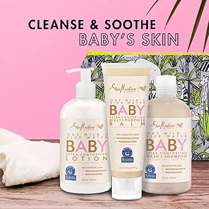 • Our SheaMoisture Oat Milk & Rice Water Baby gift set contains amazing baby skin care products such as 13oz Wash & Shampoo, 13oz baby lotion, 3.5oz balm and travel pouch