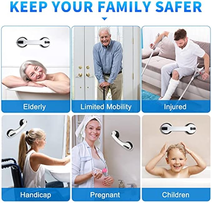 Sturdy and Durable - The shower handles is made of plastic, 2 suction cups with strong power, very sturdy and durable. You won't slip even when wet, providing comfortable experience in bathroom, tub, shower and toilet handrail. NOTE: The product will work best on a flat, non-porous surface. An uneven surface or textured surface will result in a suction cup which is NOT securely fixed. Comfortable & Non Slip Grip - Two strong shower handle design works on any non-porous and flat surface, including tile, glass, acrylic and fiberglass. the grab bar provides additional stability when entering and exiting the tub or shower for comfortable experience.The suction grab bars for bathtubs and showers have comfortable easy to grip handles that ensure a non-slip grip for more stable and enhanced security. Tips - The shower handle is suitable for smooth, dry and clean surface. Clean and dry surfaces thoroughly before installation to ensure smooth, non-porous surfaces. Check the stability of the suction cup periodically. This grab bar is to be used ONLY to ASSIST and help support properly a person's body, not to stand full body weight. Use with caution and test proof the suction of cups before using it. NOTE: The grab bars can not be mounted on grout seams. Easy to Install - Shower handle is easy to install, no tools required and no drilling needed. Just flip the locking latches to secure bar in place. You can change its location according to your current need. The grab bar doesn’t harm the surface it’s on nor leaves marks when placed right. Portable - Shower handle is portable and compact, so you can take it when you travel & easily install it in hotel rooms or guest bathrooms, take it with you everywhere you need, just push down the locking latches to firm or flip them up to release. They are nice mothers day gifts, fathers day gifts, birthday gifts, house warming gifts new home gifts, christmas day gifts. Great bathroom safety, aids & accessories, shower rails for seniors no drill, shower hand rail, agarraderas para baños, balance assist shower accessories, helping handle for pregnant women, stair railing. They can be used on tiles, glass, hard plastic surfaces.