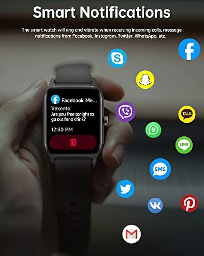 • 【1.8-inch Large Screen & Smart Notification】The smart watch with 1.8 inch HD-LCD full touch screen Panda glass screen which can provide excellent picture quality and high sensitivity touch, scratch resistant. You can set the watch face to show your personality with the existing images or upload images. The smart watch will ring and vibrate when receiving incoming calls, message notifications from Facebook, Instagram, Twitter, WhatsApp, etc. Never miss any important calls or messages.