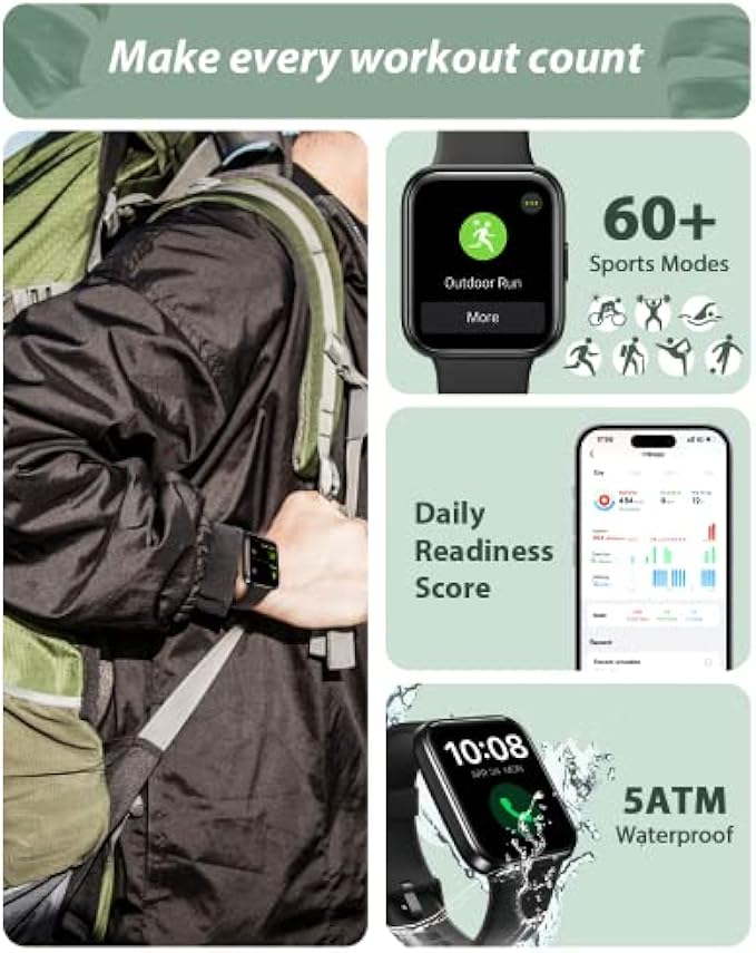 • 【Fitness Tracker & 60 Sports Modes】Fitness watch comes with 60 sports modes such as soccer, walking, running, swimming, hiking, cycling, mountaineering, yoga, etc. Accurately record all-day activities like steps, distance, calories burned, miles walked, and active minutes. The fitness tracker for men women is 5ATM waterproof, so you can wear it in the swimming pool, wash hands, and shower without worry. However, it is not recommended for use in hot water or seawater.