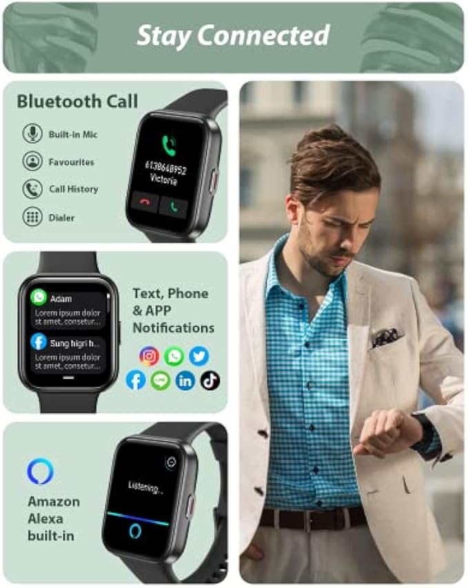 • 【Call Receiving/Dialing & Alexa Built-in】Directly use the smart watch with text and call to make and answer calls through the built-in microphone. Stay connected to SMS and APP messages(Text, Facebook, WhatsApp, Instagram, Twitter, etc.), never miss any important information. Amazon Alexa on your smartwatch for men frees your hands from your phone. Ask questions, control music playback, check weather, set alarms, timers, and more just by speaking to your watch.