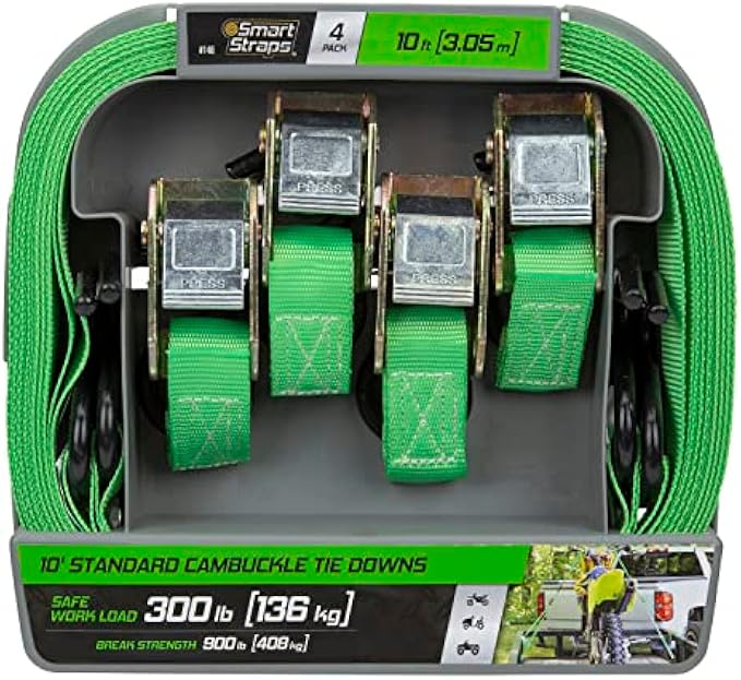 SmartStraps 10-Foot Cambuckle (4pk) 900 lbs Break Strength, 300 lbs Safe Work Load– Tie Down Fragile and Lighter Loads for Transport – Offers More Security Than Rope