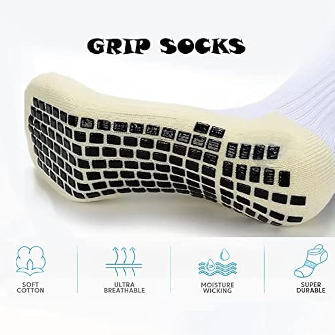 ⚽ Size & Fabric: The soccer grip socks are made of elastic nylon and soft cotton to provide a soft and comfortable wearing sense and it also breathable. One size for adult right now fit a range of 6.5-11.5 for men and for women it’s 8-13, unisex non skid black and white socks. Any problems please contact customer service and we will reply ASAP.