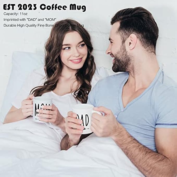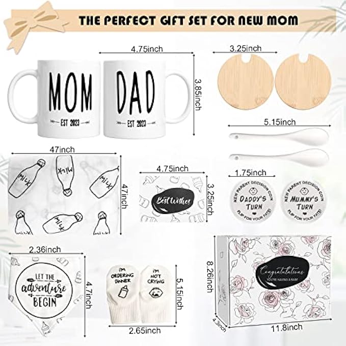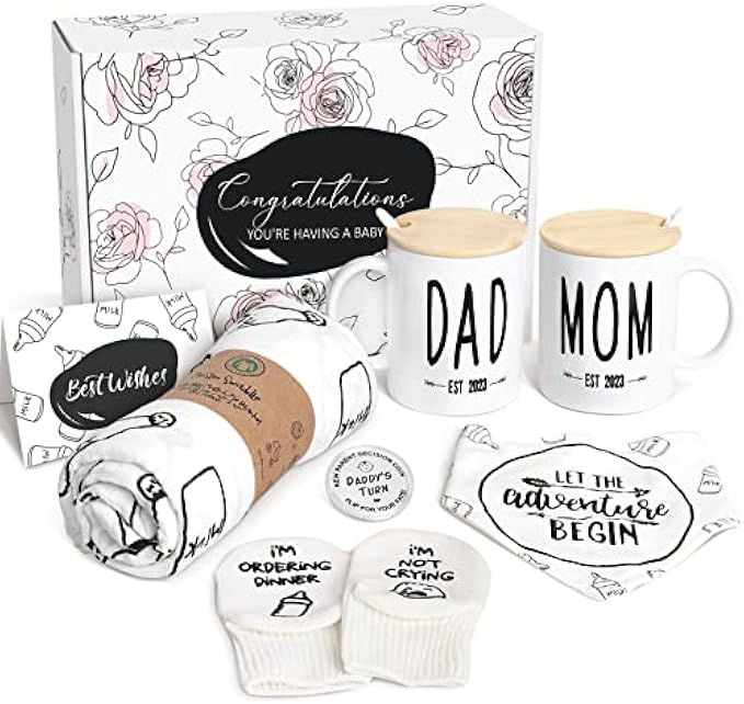 ?【Perfect Gift for New Mom and Dad】Don't know what to gift for baby shower? This set is probably your best choice! Includes mom and dad coffee mug with lid and spoon, new parent decision coin, baby muslin swaddle blankets, baby bib, creative baby socks, and an adorable greeting card. Each item is specially designed and any expecting parent will be delighted to receive it. Be prepared with the new baby announcement! ?【Mom and Dad est 2023 Coffee Mug】The 11oz durable ceramic mug is sturdy and reliable, double-sided printed, can be used in the oven, microwave, freezer or dishwasher. They also come with a wooden lid and a food-grade ceramic spoon to ensure they can enjoy the full-bodied coffee flavor. Mom Mug and Dad Mug reveal their new baby is Est 2023! ?【Baby Muslin Swaddle Blanket】Measure 47" x 47", our swaddle cloth is made of muslin cotton, a natural fiber fabric with high durability and will become softer after many washes, use it to gently wrap your baby, to create a comfortable and gentle touch, which will be as safe and reliable as in the arms of a mother. The baby swaddle blanket can also be used as a nursing cover, storage blanket, burp cloth, tummy blanket and more, and is a daily essential for every newborn. ?【Fun Baby Bib and Socks】The 100% cotton baby bibs are printed with: "LET THE adventure BEGIN", which means the beginning of the baby's exploration in this new world; the non-slip baby can be used for 3-12 months Garters read "I'm Not Crying, I'm Ordering Dinner", Super soft and cuddly, these fun words will put a smile on the face of every new parents who receives this gifts basket! ?【Fun Decision Coins & Greeting Cards】Decision coins are engraved on both sides, which can help parents decide who will change the baby's diaper, let parents share the burden! Comes with a greeting card to send the most sincere wishes! Perfect for baby showers, pregnancy announcements, gender reveal party, Christmas, Mother's Day, or any occasion to express your happiness and love.