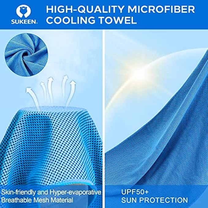 Microfiber INSTANT COOLING, REUSABLE - Hyper-evaporative breathable mesh material makes it easy to activate the chilling towel when you simply soak, wring out and snap it. The unique cooling system uses moisture from the towel to draw the sweat away from your skin to keep you cool. Everyone can use the cooling towel, even pets. KEEP CHILLS - The towel stays chilled for up to 3 hours (depending on conditions). No chemicals are used in the making of the cooling towels. It's perfect for hot flashes, outdoor activities, indoor exercise, fever or headache therapy, heatstroke prevention, sunscreen protection, cooling while absorbing. MULTIPURPOSE SPORTS TOWEL: It's perfect for sports fans into golf, swimming, football, workout, gym and fitness, also works for fever or headache therapy, heatstroke prevention, sunscreen protection, cooling while absorbing. Keep yourself cool during hot summer days, workout sessions, outdoor adventures or when someone has a migraine. If you are sweating a lot, rinse the 'salty water' out from time to time. Salt reduces evaporation/cooling rate. CARRYING POUCH WITH CARABINER CLIP - With the waterproof plastic pouch, it's easy to carry the cool towel on a rock climb, golf trip, corssfit training, etc. The reusable pouch is friendly to earth and saves more space than a bottle. The storage pouch comes with carabiner clips of vibrant colors that match the towel, making it a great gift for all ages. The clip makes it convenient to attach the cooling towel to the belt of sports bag and traveling backpack. CUSTOMER SERVICE - Please do mail us if you face any problems or not happy with the item, our team is always there for you to resolve any issues or do a full refund. Make sure to order from Sukeen, your cool summer will be starting from here.