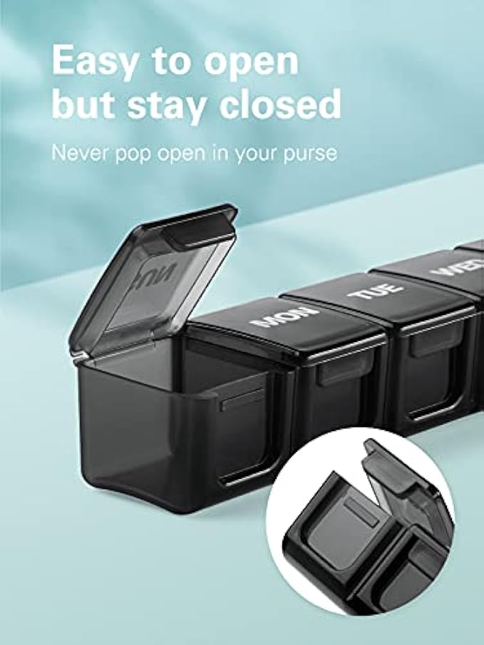 SIMPLE TO OPEN AND CLOSE: Our pill box opens with the minimal force for arthritis-friendly. The indented flap makes opening effortless. A secure lid prevents dust or moisture and keeps the pill box tightly closed when dropped and prevents spills