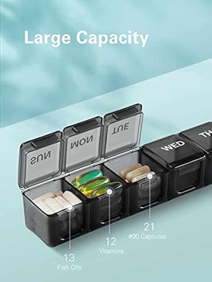 Sukuos Extra Large Pill Organizer, Weekly Pill Box, Pill Case with Clear Lid, Arthritis Friendly Medicine Organizer for Vitamins, Fish Oils or Supplements, BPA Free Medicine Organizer, Easy to Clean